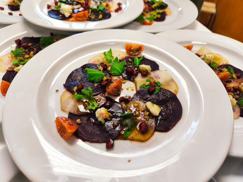 Carpaccio de pêra e beterraba com gorgonzola